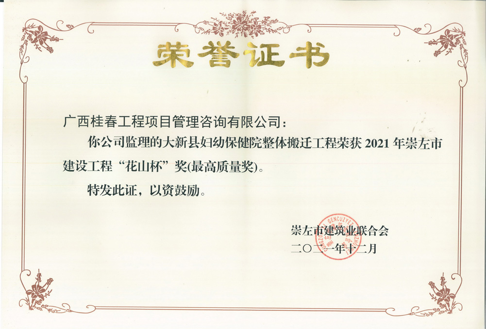 2021年崇左市建设工程“花山杯”奖(最高质量奖)