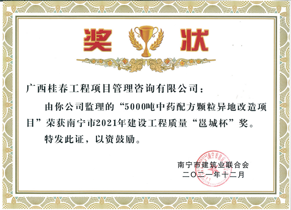 2021年建设工程质量“邕城杯”奖-5000吨中药配方颗粒异地改造项目-总监:黄子雄
