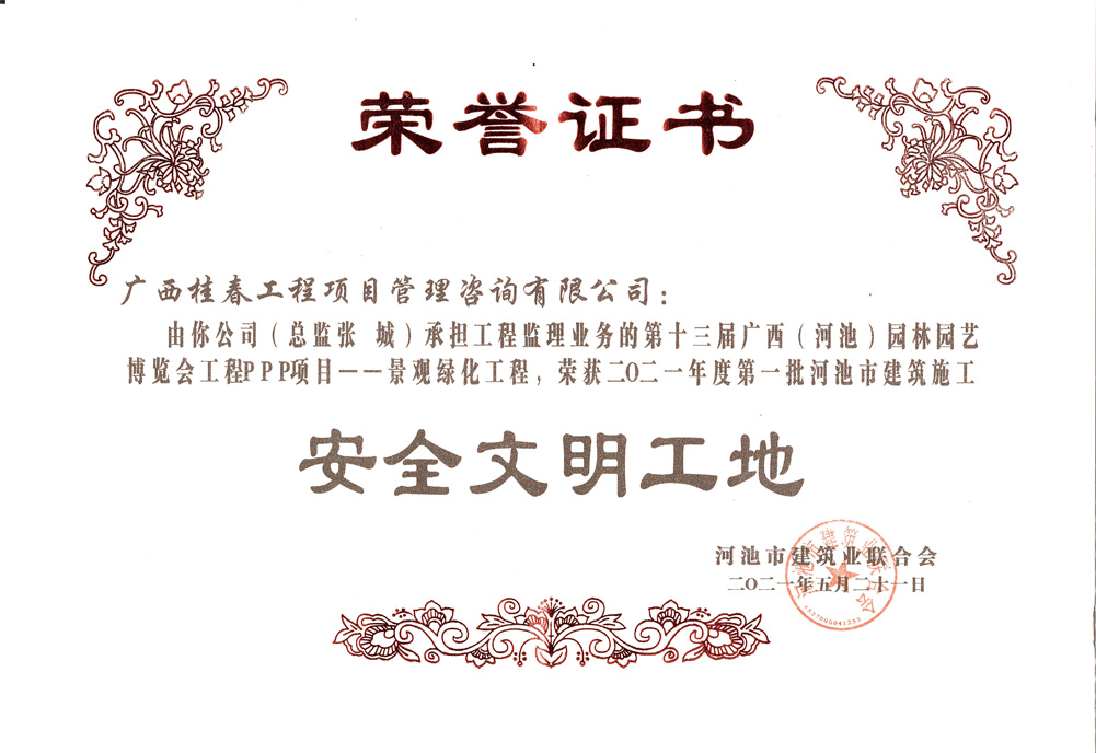 2021年度第一批河池市建筑施工安全文明工地奖-第十三届广西(河池)园林园艺博览会工程PPP项目--景观绿化工程-总监:张城