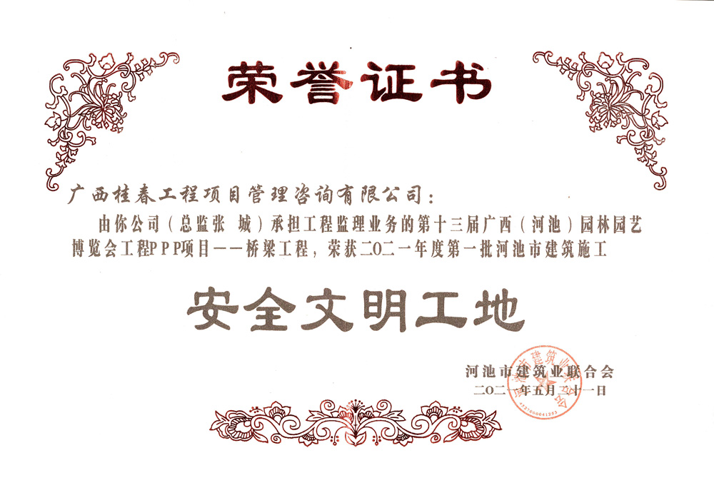 2021年度第一批河池市建筑施工安全文明工地奖-第十三届广西(河池)园林园艺博览会工程PPP项目--桥梁工程-总监:张城