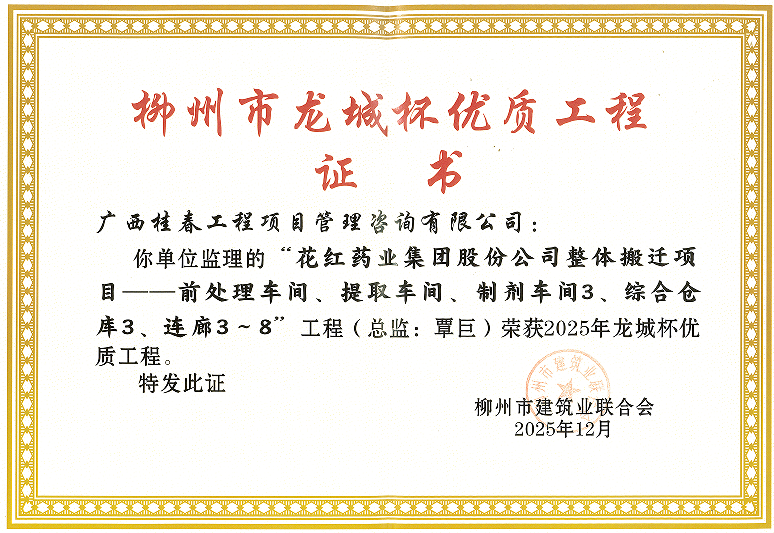 2025年龙城杯优质工程花红药业集团股份公司整体搬迁项月--前处理车间、提取车间、制剂车间3、综合仓库3、连廊3~8”工程
